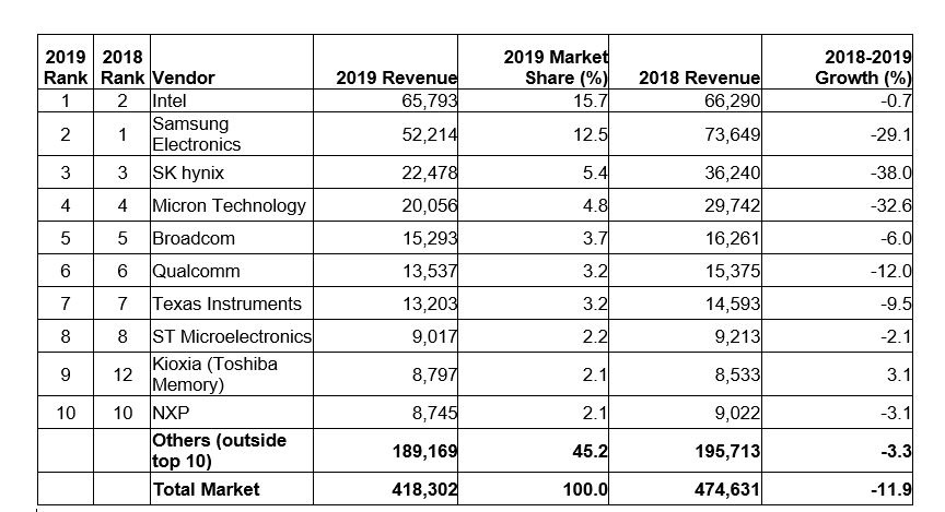La top ten dei vendor mondiali di semiconduttori (dati in milioni di dollari su fonte Gartner gennaio 2020)Entrando ancora più in dettaglio, nel 2019 Intel ha riacquistato la leadership di primo fornitore globale di semiconduttori a spese di Samsung Electronics, che l'aveva mantenuta negli ultimi due anni.