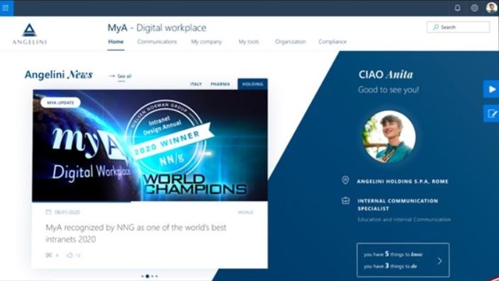 dove trovare tutti gli strumenti digitali utili al lavoro quotidiano, gli aggiornamenti e le comunicazioni aziendali, in modo da facilitare la sinergia e la collaborazione tra le diverse linee di business e le sedi geografiche del gruppo Angelini. Caratteristiche che sono valse al progetto l’ambito