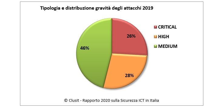 livelli di impatto, sulla base di variabili di tipo geopolitico, sociale, economico (diretto e indiretto) e di immagine. Nel 2019 gli attacchi andati a buon fine hanno avuto nel 54% dei casi un impatto “alto” e “critico”, mentre il 46% è stato di gravità “media”.