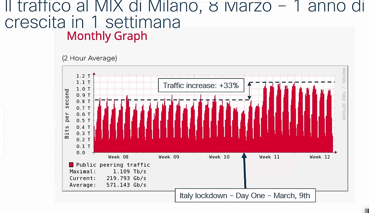 l’aspetto più complesso da gestire non è stato il singolo picco di traffico quanto la contemporaneità dell’uso della rete da parte di un numero molto maggiore di utenti, che è stato affrontato intervenendo velocemente sulla rete backbone a livello metro e sui peering point internazionali e nazionali”.