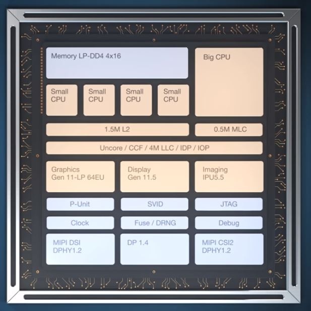 In pratica i componenti sono disposti su quattro strati l'uno sull'altro. Oltre ai sopraccitati core, il package include i controller I/O, la GPU, il controller di memoria e una memoria PoP (package-on-package). Stando ai dati ufficiali di Intel, la dimensione del package del Core i5-L16G7 è stata ridotta fino al 56% e quella della scheda fino al 47% rispetto all'Intel Core i7 8500Y.
