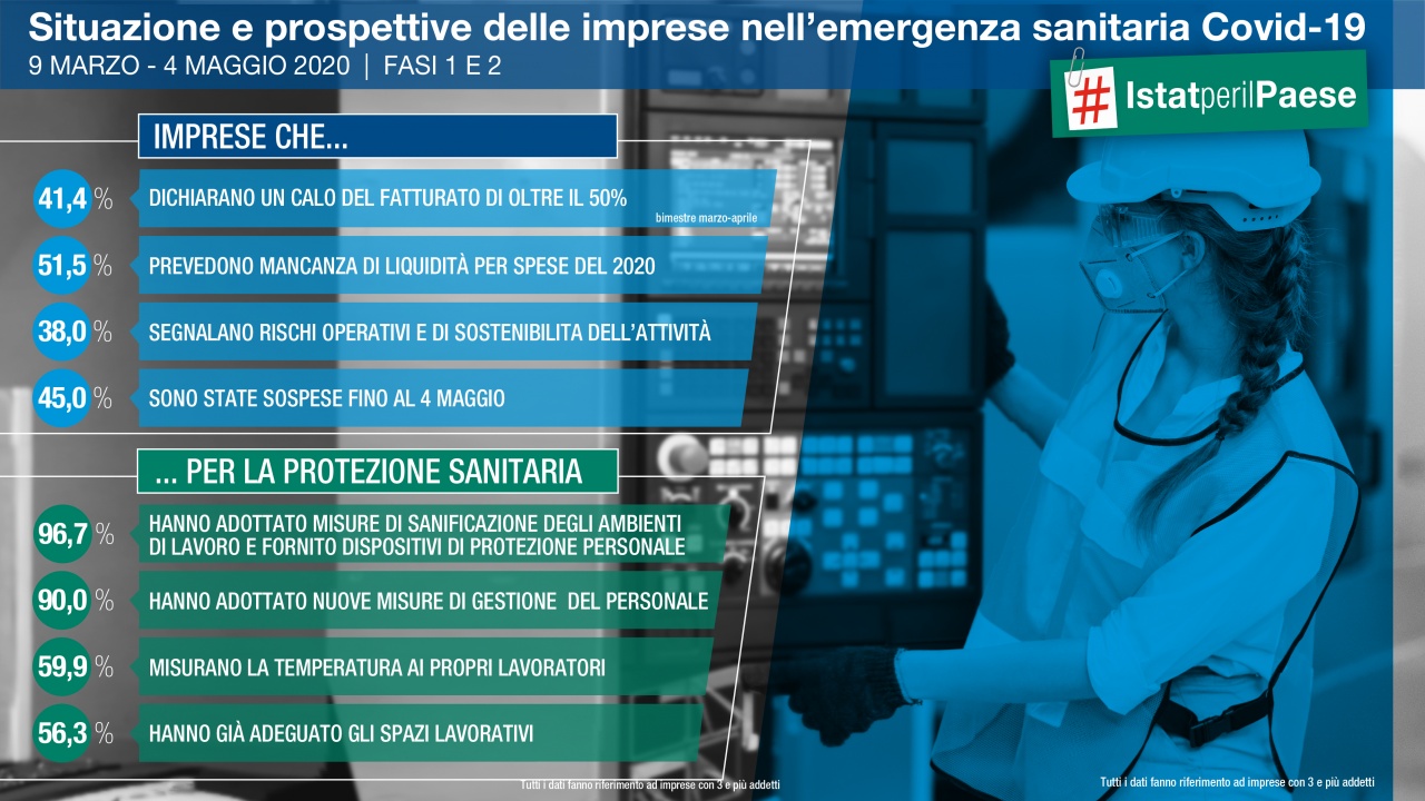 "Situazione e prospettive delle imprese nell’emergenza sanitaria Covid-19” è il titolo della rilevazione condotta dall’Istat tra l’8 e il 29 maggio 2020, con l’obiettivo di raccogliere valutazioni direttamente dalle imprese in merito agli effetti dell’emergenza sanitaria e della crisi economica sulla loro attività. In questo Report vengono presentati i primi risultati, i quali forniscono tempestivamente a cittadini, operatori economici e decisori pubblici evidenze statistiche di elevata qualità su come le nostre imprese stanno vivendo questa difficile fase della storia del Paese, con particolare riferimento all’impatto economico, finanziario e sull’occupazione. Nella fase 1 dell’emergenza sanitaria (tra il 9 marzo e il 4 maggio) il 45,0% delle imprese con 3 e più addetti (458 mila, che assorbono il 27,5% degli addetti e realizzano il 18,0% del fatturato) ha sospeso l’attività. Per il 38,3% (390 mila imprese) la decisione è stata presa a seguito del decreto del Governo mentre il 6,7% (68 mila) lo ha fatto di propria iniziativa. Il 38,0% delle imprese (con il 27,1% di occupati) segnala rischi operativi e di sostenibilità della propria attività e il 42,8% ha richiesto il sostegno per liquidità e credito (DL 18/2020 e DL 23/2020). Riorganizzazione di spazi e processi (23,2% delle imprese) e modifica o ampliamento dei metodi di fornitura dei prodotti/servizi (13,6%) le principali opzioni adottate per far fronte alla crisi. A livello settoriale, sono soprattutto le imprese delle costruzioni e dei servizi ad aver sospeso l’attività: rispettivamente il 58,9% e il 53,3% rispetto al 36,0% dell’industria in senso stretto e al 30,3% del commercio. Oltre il 70% delle imprese (che rappresentano il 73,7% dell’occupazione) dichiara una riduzione del fatturato nel bimestre marzo-aprile 2020 rispetto allo stesso periodo del 2019: nel 41,4% dei casi il fatturato si è più che dimezzato, nel 27,1% si è ridotto tra il 10% e il 50% e nel 3% dei casi meno del 10%; nell’8,9% delle imprese il valore del fatturato è invece rimasto stabile.