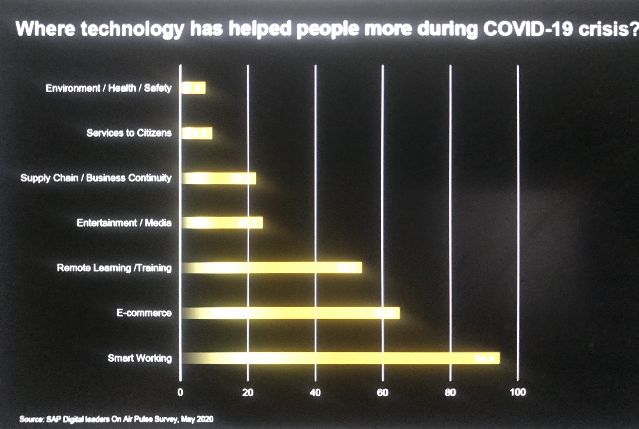 Quello dell’e-commerce, del lavoro agile, della riconversione di progetti o catene produttive sono solo alcuni esempi che evidenziano il ruolo fondamentale delle tecnologie digitali tutti ambiti tecnologici su cui Sap sta rimodellando la propria offerta, ma il valore non sta però nella tecnologia in sé. La videoconferenza di oggi è l’equivalente del fax negli anni '80, in quanto permette di mantenere contatti e relazioni, il vero valore va ricercato nel senso profondo della rivoluzione portata dal digitale”, commenta.