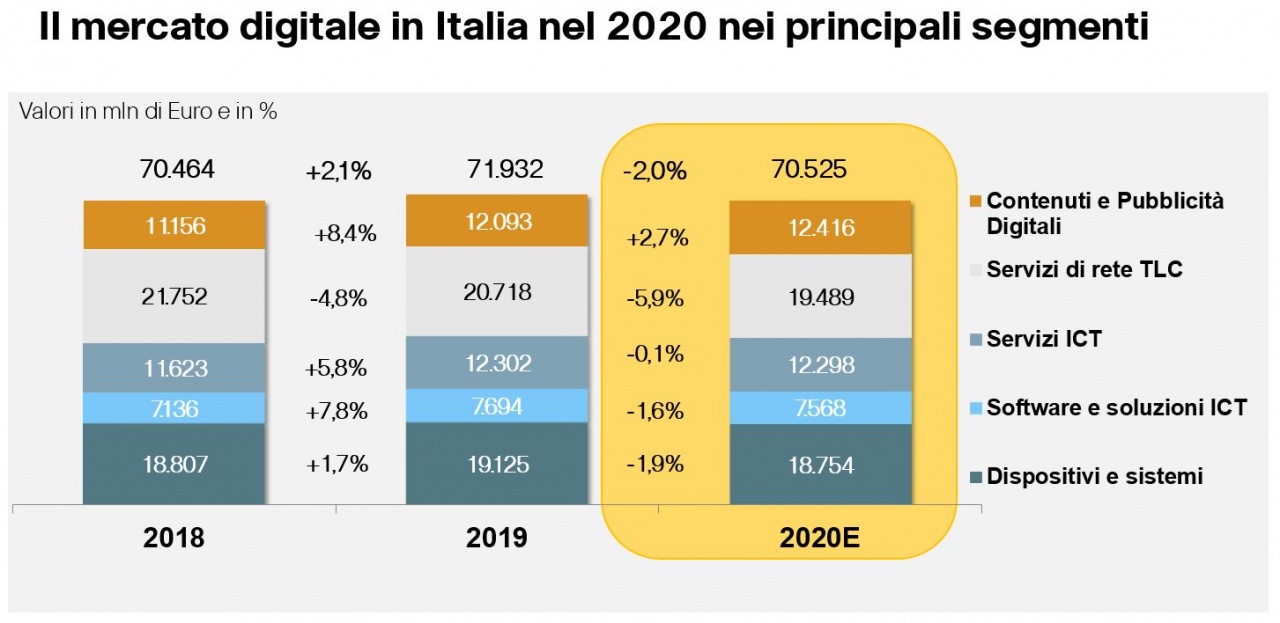 per l’intero 2020 il mercato digitale italiano, secondo lo scenario più probabile e grazie al relativo recupero nella seconda metà dell’anno, è atteso chiudere