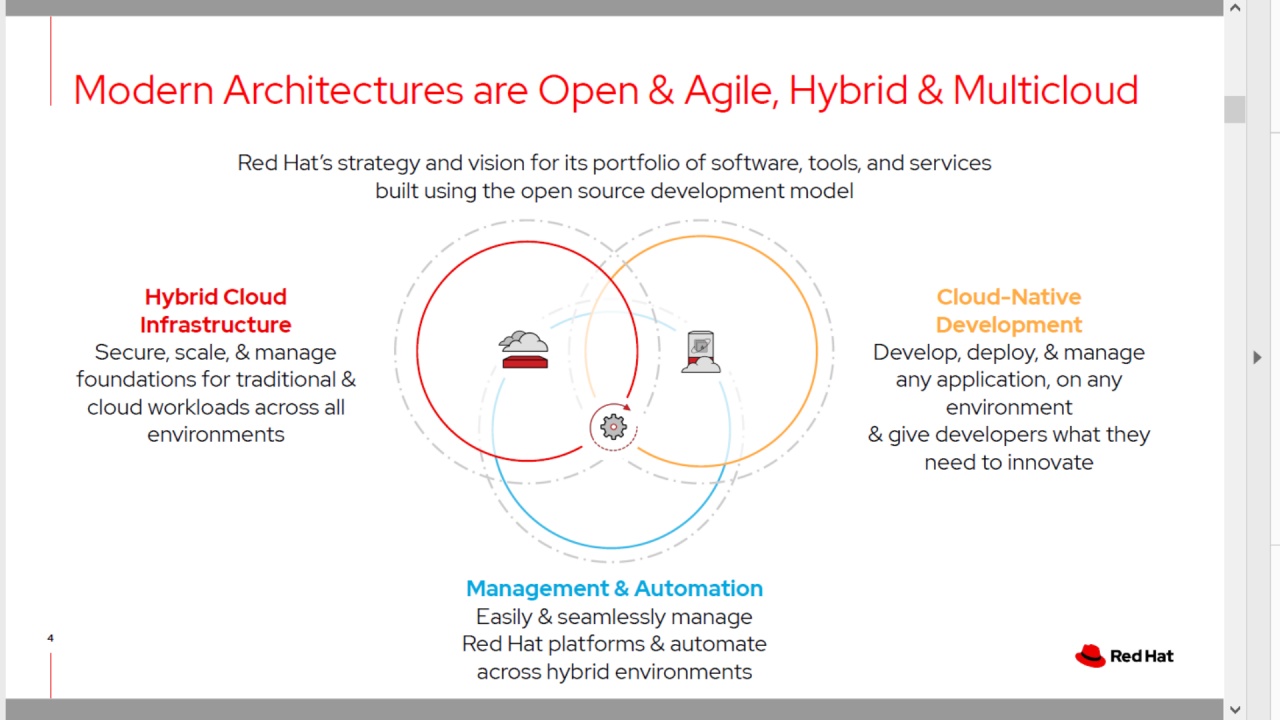 Red Hat risponde con un’offerta ricca e flessibile, in grado di rispondere alle necessità tecnologiche e di business delle organizzazioni che intendono portare il loro business nel futuro, senza rinunciare a benefici concreti e misurabili già nel breve termine. Questi i pilastri su cui si basa l’offerta Red Hat in ottica di trasformazione digitale: