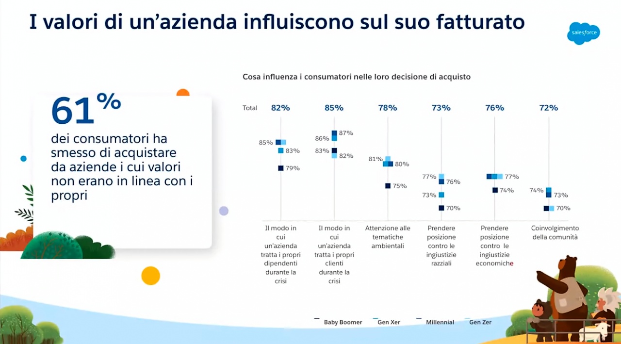 Infine, allargando ulteriormente il discorso al ruolo delle aziende nella società nel suo complesso, dall’indagine emerge anche che i clienti chiedono che i brand dimostrino i loro valori in merito ai problemi sociali, economici ed ecologici, chiedendo alle imprese di fare la propria parte per correggere ciò che ancora non funziona, con l’87 per cento dei consumatori italiani che indica che il ruolo sociale delle aziende sta cambiando. Si tratta di un dato nettamente superiore al 56 per cento globale, che si presta a più di una riflessione, soprattutto se collegato a un altro dato cruciale emerso dall’indagine di Salesforce: il 61 per cento dei consumatori ha smesso di acquistare da aziende i cui valori non erano in linea con i propri. Le aziende sono avvertite.