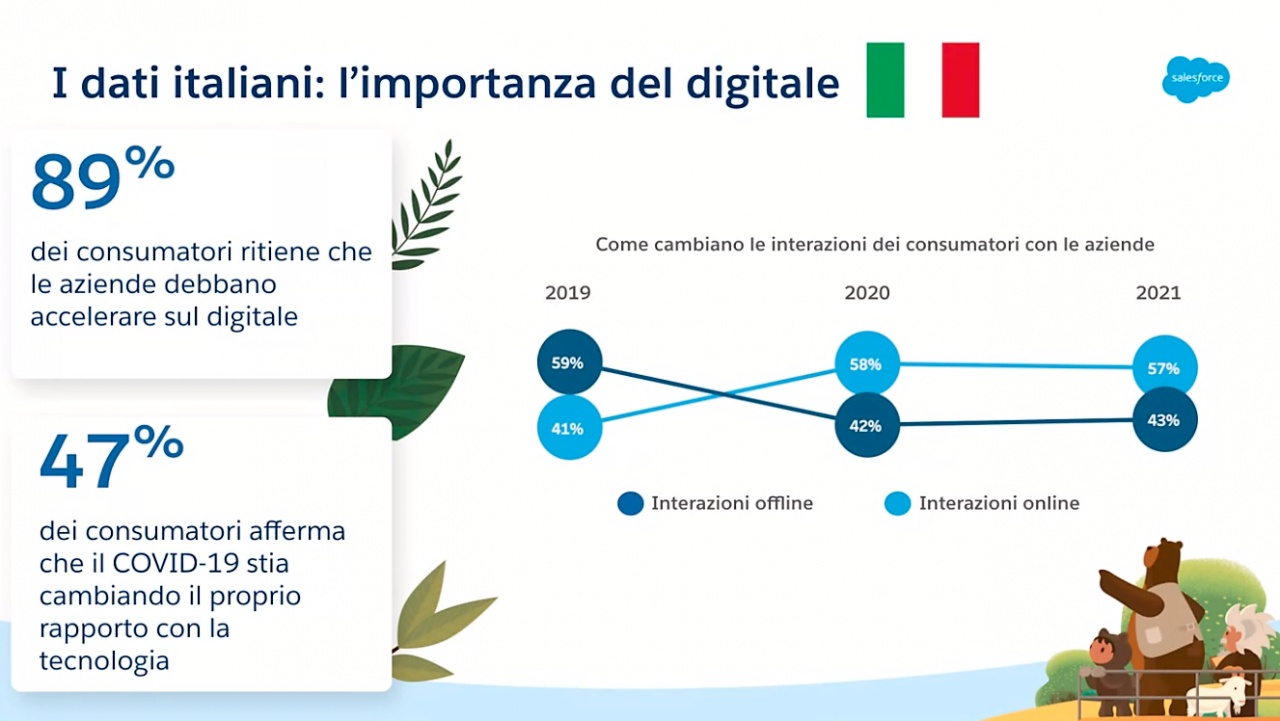 Entrando nei dettagli riguardanti il nostro Paese, un dato si impone subito all’attenzione: “per la prima volta da quando Salesforce conduce l’indagine, nel 2020 ci saranno più interazioni online rispetto a quelle online, con un 58 per cento per le prime e il 42 per le seconde”, fa notare Buffoni, evidenziando che “nel 2021 questo trend continuerà con percentuali analoghe”.