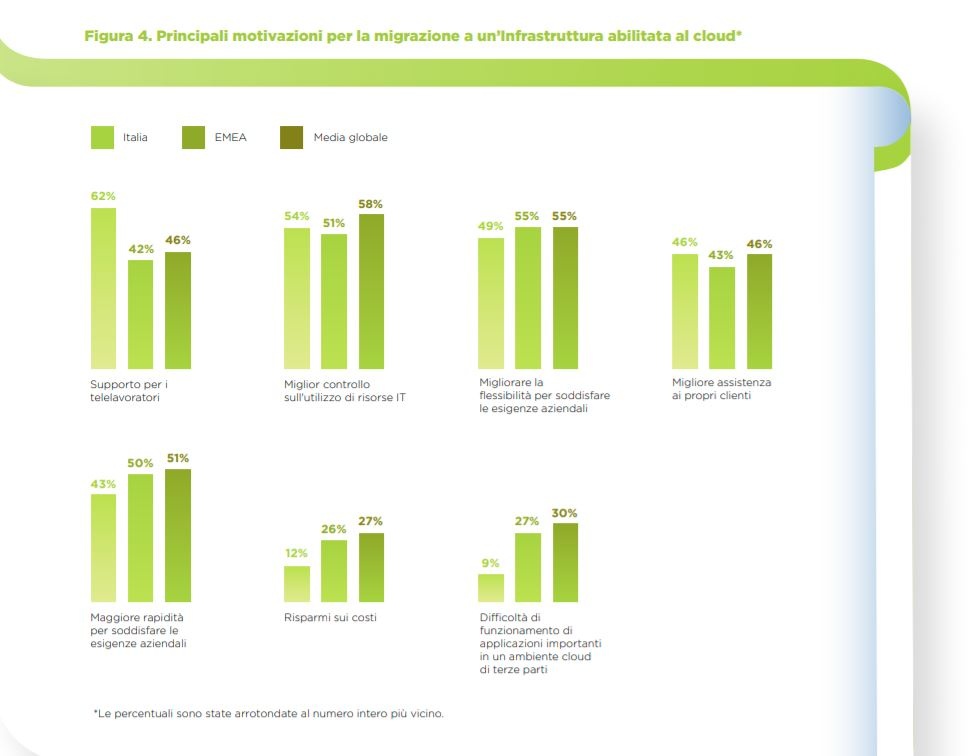 flessibilità per soddisfare le esigenze di business (49%). Il risparmio sui costi, contrariamente a quanto si potrebbe pensare, si posiziona all'ottavo posto, con una percentuale del 12%, ben inferiore a quella Emea, pari al 20%, e a quella globale del 27%.