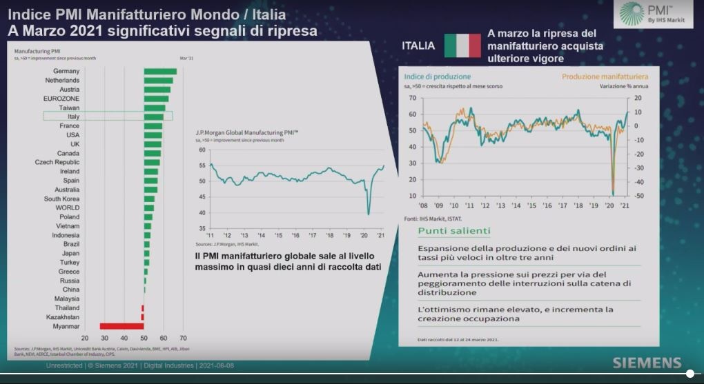 Giuliano Busetto, Head of Digital Industries di Siemens, sottolineando come l’indice di produzione del manifatturiero italiano sia ormai in rapida ripresa dopo il crollo dell’anno scorso causato dalla pandemia.