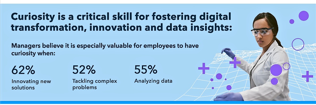 La maggior parte dei manager concorda sul fatto che la curiosità è particolarmente preziosa quando è necessario innovare le soluzioni offerte (62%), quando si affrontano problemi complessi (55%) e quando si analizzano i dati (52%).