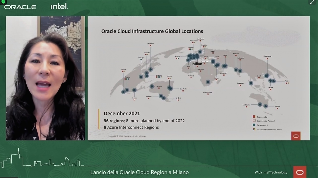 Il tema della sovranità del dato, ovvero quello di mantenere i dati entro i confini dei diversi Paesi o aree geografiche è stato anche menzionato da Jae Evans, CIO di Oracle, intervenuta in collegamento dall’headquarter di San Francisco, che ha anche ricapitolato i piani di espansione del cloud di casa Oracle. Con quello di Milano, oggi il cloud Oracle di nuova generazione è disponibile in 36 Region a livello mondiale, con l’obiettivo di averne almeno 44 attive entro la fine del 2022, proseguendo su uno dei più rapidi percorsi di espansione nel settore.