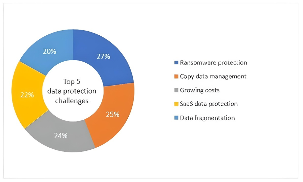 Quando si tratta di protezione dei dati nel cloud ibrido, IDC sostiene che gli approcci tradizionali non stanno funzionando. Come mostra il grafico qui in basso, le aziende temono che le architetture di protezione dati esistenti non siano all'altezza di affrontare sfide come il ransomware, la gestione dei dati SaaS e la dispersione dei dati su una moltitudine di repository differenti.