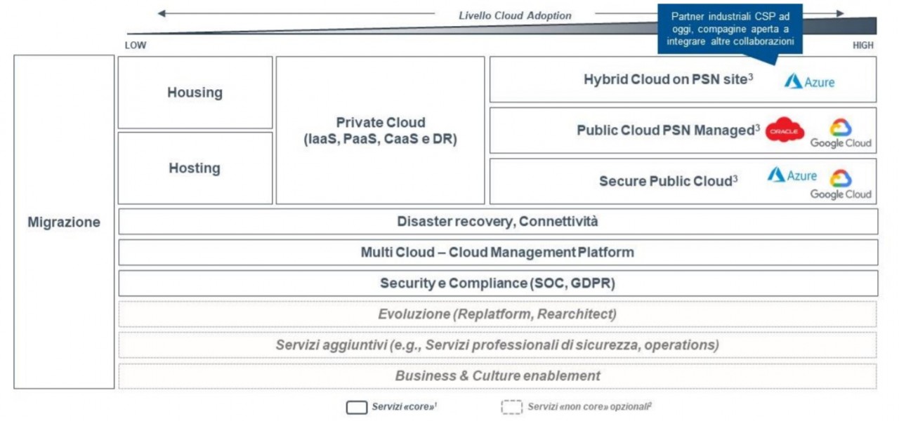 Il ruolo e i servizi offerti dal PSN sono delineati abbastanza chiaramente nella Strategia Cloud Italia. Parliamo di una infrastruttura di data center distribuiti sul territorio nazionale che ospiteranno i dati ed i servizi critici e strategici di tutte le PA centrali (circa 200), delle ASL e delle principali PA locali (Regioni, città metropolitane, Comuni con più di 250 mila abitanti). In più, dovrà anche offrire i servizi necessari a traghettare tutte queste realtà verso il mondo cloud, ossia per effettuare concretamente la migrazione dei dati e servizi delle amministrazioni coinvolte.