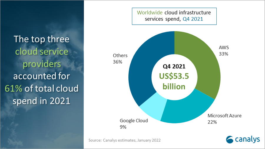 Per la prima volta, la spesa globale delle aziende in servizi cloud infrastrutturali, ossia di tipo IaaS e PaaS, ha superato in un trimestre la soglia anche psicologica dei cinquanta miliardi di dollari. Lo evidenzia Canalys, secondo cui nel quarto trimestre 2021 questa spesa infrastrutturale è stata di circa 53,5 miliardi di dollari. Con un incremento del 34% anno su anno, incremento che in valore è stato di ben 13,6 miliardi di dollari. La spesa IaaS e PaaS per tutto il 2021 è stata di 191,7 miliardi di dollari, con una crescita anno su anno del 35%.