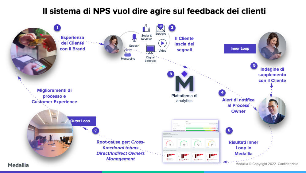 Una volta identificata l’origine, queste informazioni confluiranno anch’esse all’interno della piattaforma di analytics dove i responsabili di funzione o i vari reparti avranno a disposizione un repository di tutte le cause che hanno generato esperienze negative (ma, ribadiamo, anche molto positive) per comprendere e decidere quali processi o elementi strutturali/organizzativi dovranno essere migliorati o replicati. È a questo punto che si entra nel pieno del processo di outer loop, volto alla vera e propria fase operativa che può tradursi, per esempio nel miglioramento di un dato processo di delivery della merce o nella pianificazione di un determinato programma di formazione per gli store manager utilizzando le best practice dei capi negozi particolarmente performante in termini di NPS (net promoter score) oppure nella revisione del testo di un’offerta di rinnovo.