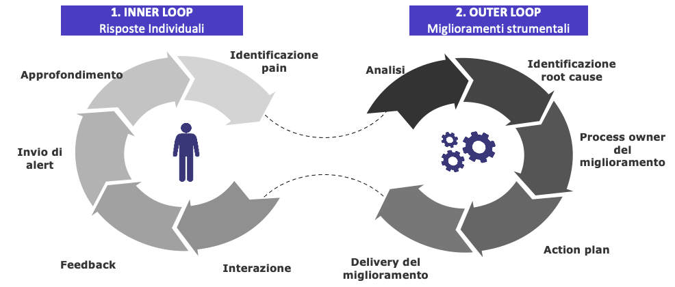 In termini operativi il Close the Loop si compone di due momenti: il processo di caring dell’utente – detto inner loop - e il processo di miglioramento strutturale, definito invece outer loop. Quando si parla di inner loop, è importante considerare che i numerosi segnali che i clienti lasciano nelle loro diverse interazioni - anche se raccolti e collezionati all’interno di una piattaforma di analytics di CXM - non sono spesso sufficienti per “chiudere il cerchio”. Comprendere la vera natura dell’eventuale insoddisfazione o delusione (anche di un elevato apprezzamento) di un cliente può infatti risultare estremamente difficile o, in molti casi, tradursi in facili ed errate semplificazioni.