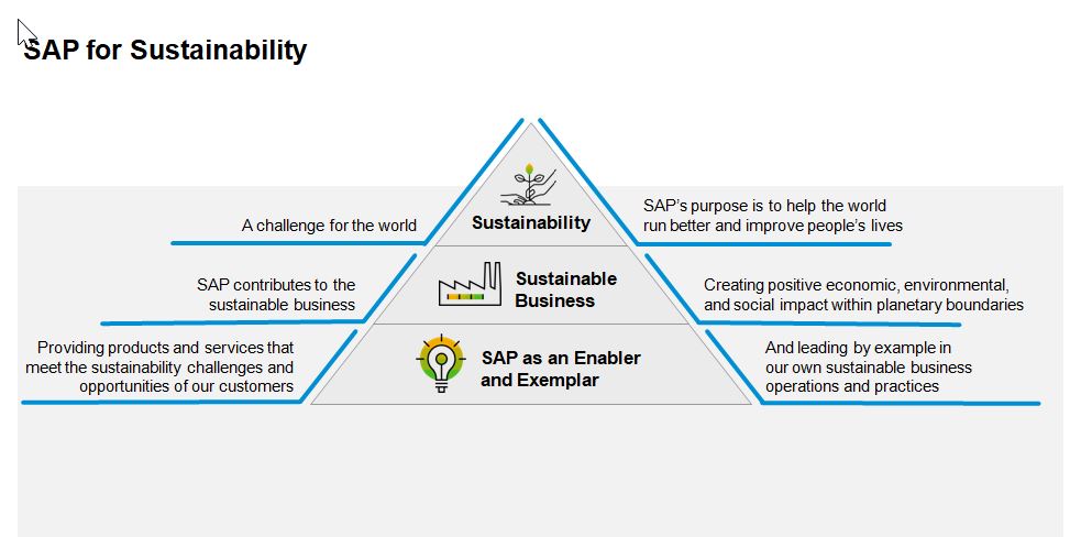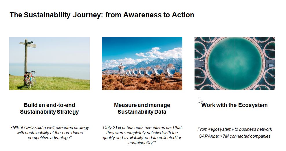 Oggi la sfida più grande secondo SAP è quella di riuscire a integrare questa visione di sostenibilità nei processi di business, spostandosi da un’economia lineare a un’economia circolare, prendendo in considerazione i modelli di business; significa, per esempio, ripensare all’ottimizzazione della catena logistica riducendo e minimizzando le emissioni di carbonio o come progettare e sviluppare i prodotti in ottica di minimizzare gli scarti, …: “Andare nei processi di business mette in luce i benefici dell’innovazione tecnologica verso la sostenibilità”.