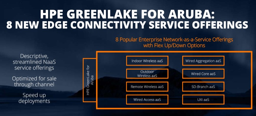 HPE GreenLake for Aruba di fatto rende tutta l'offerta HPE Aruba disponibile come servizio, in logica GreenLake. Ma per semplificare la scelta dei clienti sono stati anche definiti otto "service pack" per i casi d'uso più comuni. Tre in ambito WLAN (Indoor Wireless, Outdoor Wireless, Remote Wireless), tre in ambito reti cablate (Wired Core, Wired Aggregation, Wired Access), uno specifico in ambito SD-Branch, uno trasversale a tutti i tre macroambiti (User Experience Insight).