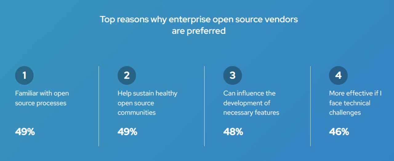 Abbiamo anche visto l’ascesa della sicurezza come importante vantaggio dell’open source enterprise. Quest’anno, l’89% dei leader IT ritiene che sia sicuro almeno quanto il software proprietario.