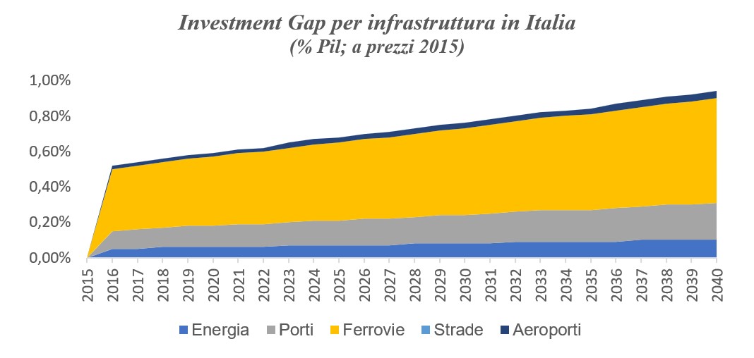 In Italia, spiega PwC, il divario tra gli investimenti attuali in infrastrutture e il fabbisogno ottimale al 2040 ammonterà a 373 miliardi di euro (lo 0,73% del PIL nazionale). I settori più interessati da questo ritardo sono il ferroviario (238 miliardi circa), il portuale (79 miliardi) e l'energetico (39 miliardi). Un gap importante che ne provoca un altro, come spiega Andrea Toselli, Presidente e AD di PwC Italia: "Il gap infrastrutturale fisico del nostro paese costa 70 miliardi di euro ogni anno in termini di export, pari a 15% del totale". Meglio quindi metterci mano, concretamente e in fretta.