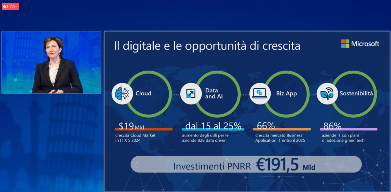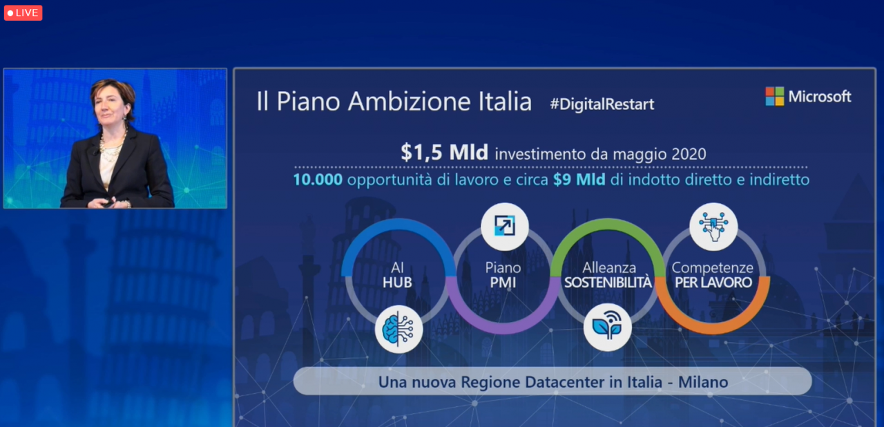 E le opportunità di rilancio e di re-immaginazione del futuro offerte oggi dalle tecnologie sono state il vero focus dell’evento: un appuntamento diventato ormai annuale nel quale Microsoft Italia fa il punto sul piano quinquennale da 1,5 miliardi di dollari di investimento in tecnologia e formazione a supporto della trasformazione digitale del Paese. “L’occasione di oggi è quella di fare il punto su dove ci troviamo nella digitalizzazione del nostro Paese, anche per vedere come la tecnologia ci abbia aiutato nelle fasi di risposta alla pandemia e alle tante disruption che abbiamo visto negli ultimi tempi, con la pandemia che ha anche costituito l'occasione per ripartire e trovare nuovi modi per fare business, magari anche in modo più sostenibile”, ha voluto infatti ricordare Silvia Candiani, nell’introdurre l’evento.