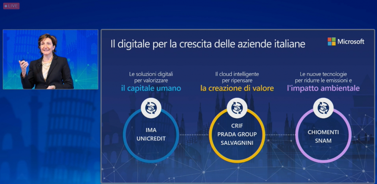 La mattinata ha visto Microsoft tracciare le linee guida per affrontare la complessità del momento e per cogliere le opportunità del Pnrr: lavoro ibrido per valorizzare il capitale umano, cloud intelligente per ripensare la creazione di valore e sostenibilità per promuovere una crescita più inclusiva. Seguendo queste tre direttrici si sviluppa l’impegno di Microsoft per sostenere l’innovazione delle aziende pubbliche e private oggi alle prese con importanti priorità: sicurezza, nuovi modelli di lavoro e discontinuità della supply chain. Ma gli altri veri protagonisti dell’evento Ambizione Italia Digital Innovation Summit sono stati i progetti delle aziende IMA, UniCredit, CRIF, Gruppo Prada, Salvagnini, Chiomenti e Snam, che hanno condiviso le loro esperienze negli ambiti lavoro ibrido, cloud e nuove tecnologie per la sostenibilità.