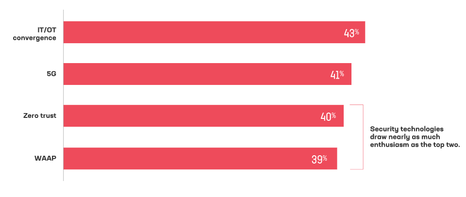 È in atto la convergenza tra IT e OT - Si tratta di un risultato correlato, gli intervistati considerano la convergenza dei sistemi IT e di tecnologia operativa (OT) come lo sviluppo più entusiasmante dei prossimi anni. L'integrazione dei sistemi OT che gestiscono le operazioni industriali e aziendali con i sistemi IT incentrati sui dati aiuterà a chiudere il ciclo di automazione e a rendere le aziende digitali più adattive, in modo da anticipare e rispondere meglio ai mutevoli interessi dei clienti e alle condizioni di mercato.