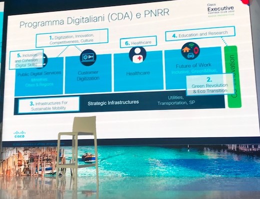 A Venezia ci si focalizza sulla dimensione tecnologica con l’Amministratore Delegato che rimarca le Big 5, le cinque principali aree abilitate da Cisco per rendere possibile la Trasformazione Digitale del Paese: il futuro delle Reti; il futuro del lavoro; la cybersecurity; l’evoluzione e lo sviluppo software in un mondo ‘cloud first’; la sostenibilità. Tutte traiettorie tecnologiche fondamentali per modernizzare in chiave digitale – e sostenibile – il Paese a patto di interpretarle in modo corretto, cogliendo tutte le opportunità messe a disposizione, a partire dal PNRR.