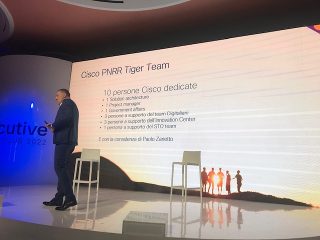 Per farlo al meglio Cisco ha creato un Tiger Team composto da 10 persone (1 solution architect, 1 project manager, 1 governament affairs, 3 persone a supporto del team Digitaliani, 3 persone a supporto dell’Innovation Center, 1 persona a supporto del STO (security & trust organization) team; con il supporto di un team di consulenti esterni coordinati da Paolo Zanetto: “Ci siamo attrezzati al meglio per essere pronti al PNRR ed essere a vostra disposizione” rimarca Florio alla platea di executive partner.