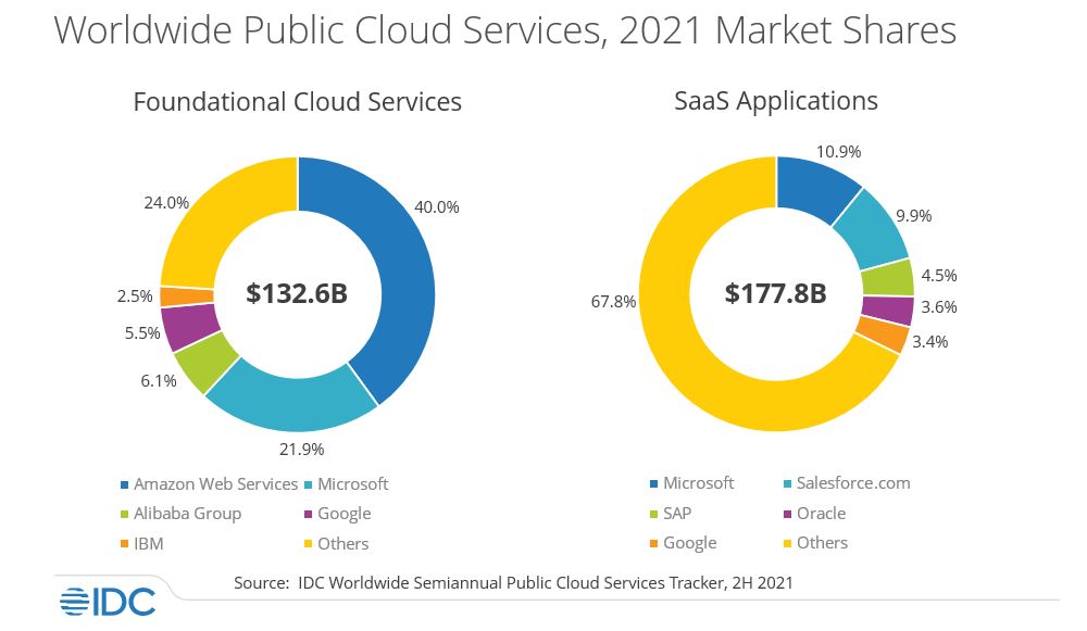 Il provider predominante non è in questo caso la solita AWS, perché IDC ha messo insieme le componenti cloud applicative e infrastrutturali. Così in cima alla classifica dei market share c'è Microsoft, l'unica che propone servizi in tutte le categorie IaaS, PaaS, SaaS - al 14,4%. AWS, che è un provider infrastrutturale praticamente puro, segue però molto da vicino, fermandosi al 13,7%.