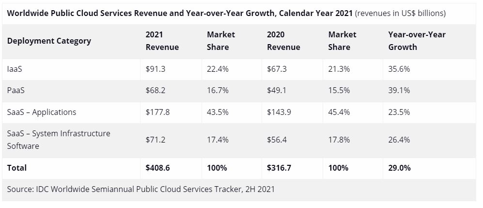 A guardare i numeri trimestrali degli analisti di mercato, ci sono pochi dubbi sull'interesse che le imprese hanno verso la migrazione in cloud dei loro processi e delle loro applicazioni. A confermarlo sono stavolta le stime IDC riguardanti il mercato del cloud pubblico, che nel 2021 ha mosso qualcosa come 409 miliardi di dollari (per la precisione 408,6) con una crescita anno su anno del 29%. Le cifre si riferiscono al complesso dei servizi applicativi SaaS (Software as a Service) e di quelli infrastrutturali IaaS (Infrastructure as a Service) e PaaS (Platform as a Service).