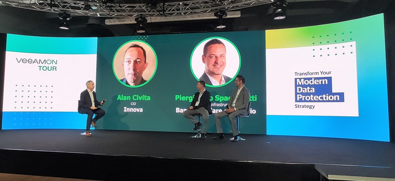 Successivamente, è stata la volta delle testimonianze di due clienti di rilievo: Alan Civita, CIO di Innova, ha tra l’altro ricordato che in occasione del passaggio a Kubernetes la società è stata il primo cliente italiano di Kasten quando Veeam l’ha acquisito, mentre Piergiorgio Spagnolatti, Head of Infrastructure di Banca Popolare di Sondrio, ha tenuto a sottolineare l’importanza delle soluzioni di Data Protection di Veeam in un ambiente altamente regolato come quello degli istituti di credito.