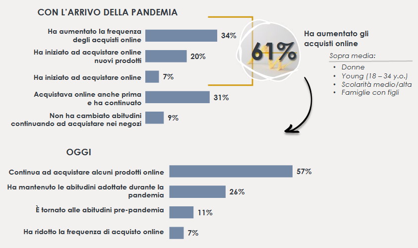Man mano che ci allontaniamo dai primi lockdown, ci rendiamo meglio conto che quei mesi sono stati uno spartiacque per il modo in cui gli italiani guardano all'ecommerce. Durante la pandemia tutti, dai più digitali ai più scettici, hanno dovuto spostare i loro acquisti online, più o meno massicciamente. E quelle esperienze hanno cambiato il mercato, sdoganando gli acquisti in rete per praticamente tutte le categorie di prodotti, escluso l'inevitabile (per ora) zoccolo duro dei prodotti freschi.