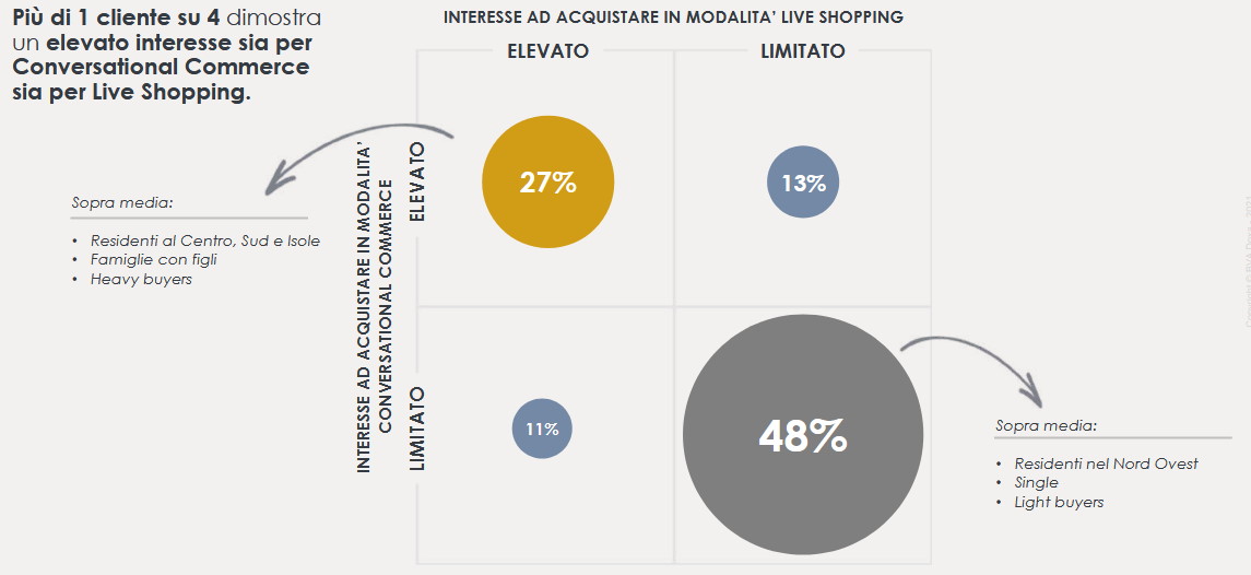 Il conversational commerce è invece la possibilità di effettuare acquisti interagendo con un assistente virtuale, ad esempio via instant messaging, con un chatbot su sito web o con un assistente vocale come Alexa. Si tratta di un sistema che in altre nazioni è diffusissimo (in Cina WeChat fa scuola in questo senso) e che presenta diverse comodità, perché supera la barriera tra linguaggio naturale ed ecommerce. Ma un limite importante: "Oggi - racconta Villa - paghiamo il cattivo exploit di diversi chatbot messi in campo più o meno di recente e che non hanno funzionato bene. I loro limiti tecnici hanno generato una sensibile diffidenza per questo strumento". L'interesse dei consumatori però c'è e le tecnologie sono molto migliorate. Quindi vale la pena riprovarci.