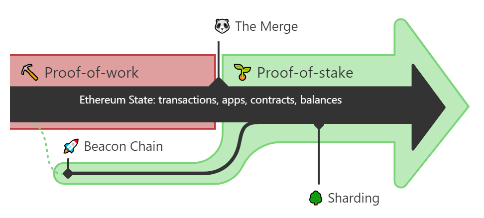 In questi due anni la Beacon Chain è stata il banco di prova, concreto e massivo, con cui testare il funzionamento del modello proof-of-stake. Ora il passaggio al nuovo meccanismo viene considerato sicuro, anche in corsa, e si procedere alla “fusione”: la Mainnet e Beacon Chain convergeranno, nel senso che lo “stato” della prima (immaginate sempre Ethereum come una macchina virtuale globale) sarà “copiato” sulla seconda. In una maniera che dovrebbe essere completamente trasparente per qualsiasi applicazione o servizio basato su Ethereum.