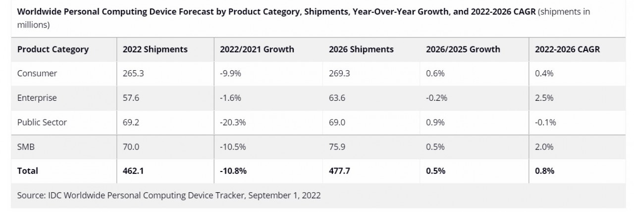 Qualcosa di positivo quindi è rimasto, come in particolare la transizione al lavoro ibrido e le sue conseguenze positive sui volumi di vendita dei PC. Tanto che nel periodo 2022-2026 il mercato PC/tablet resterà sostanzialmente statico: 462 milioni di unità consegnate nel 2022, 477 nel 2026. Tra utenti consumer, enterprise, PMI e PA, solo quest'ultimo segmento viene previsto in flessione nel quinquennio considerato.