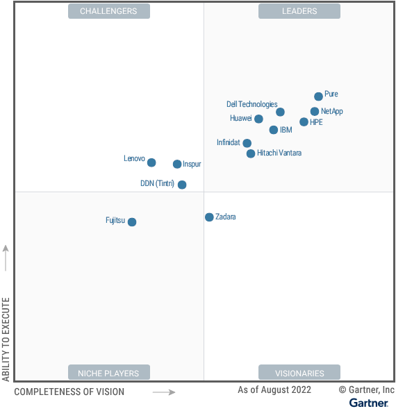 Come al solito va sottolineato che il Magic Quadrant non è una classifica, ma un ordine di preferenza comunque lo esprime. In prima fila Pure Storage, poi NetApp, a seguire tre coppie di aziende più o meno allo stesso livello, ma in cui una ha più capacità di execution e l'altra più completezza di visione: Dell Technologies con HPE, Huawei con IBM, Infinidat con Hitachi Vantara.