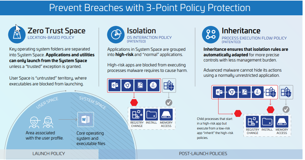 Un tool che applica una metodologia di protezione unica nel suo genere, non una soluzione di end point protection tradizionale , che risponde alla filosofia ‘Protection without detection’ in grado di prevenire le compromissioni dei sistemi impedendo alle applicazioni di eseguire processi inappropriati, consentendo loro di continuare a eseguire azioni normali, grazie a una tecnologia brevettata di isolamento dinamico e di ereditarietà