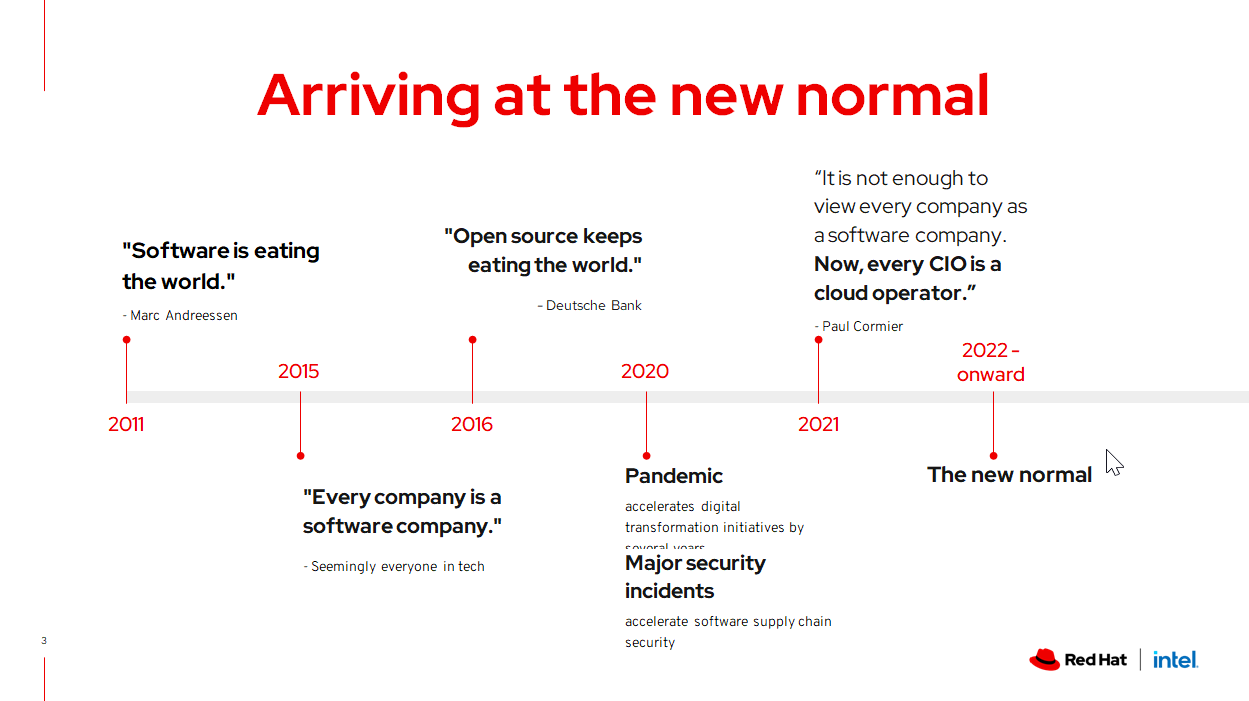 Lo scenario IT a cui fa riferimento Red Hat riguarda in specifico lo sviluppo software: ma qual è il ‘new normal’ che oggi lo caratterizza? Lo spettro temporale analizzato da Anguilletti torna indietro di una decina d’anni quando nel 2011 Marc Andreessen affermò che “il software si stava mangiando il mondo”, a sottolineare che il ‘digitale’ stava affermandosi in modo preponderante e avrebbe segnato la storia del mondo. Da allora tutte le aziende, indipendentemente dall’ambito di appartenenza, hanno come imperativo quello di trasformarsi in aziende software, utilizzando al meglio l’IT per soddisfare le esigenze dei clienti.