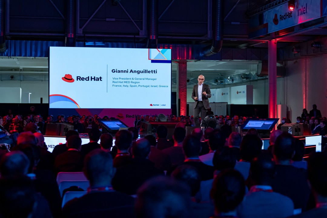 Sul palco è la volta di Gianni Anguilletti, Vice President MED, Red Hat che richiama la Stella Polare che guida le iniziative di innovazione tecnologica e organizzativa di Red Hat; stella che è anche il nome in codice delle attività relative al piano industriale aziendale presente e futuro, che ha l’ambizioso obiettivo di abilitare, amplificare e supportare le capacità trasformative dei clienti attraverso l’Open Hybrid Cloud.