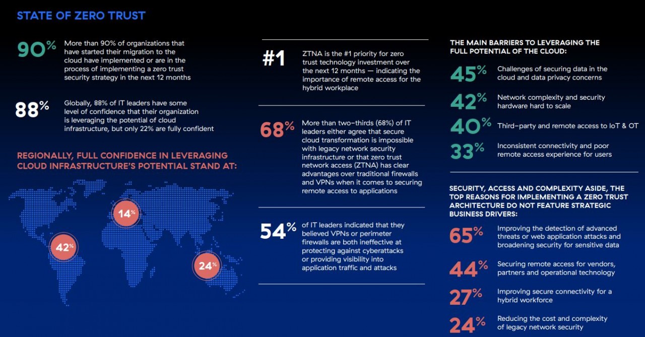 Secondo l'indagine lo pensa anche il 64% del campione italiano indagato, che ritiene come la messa in sicurezza del cloud sia impossibile con le infrastrutture di sicurezza di rete tradizionali o che le soluzioni Zero Trust presentino chiari vantaggi, rispetto ai firewall e alle VPN, per l'accesso da remoto alle applicazioni. In particolare, il 54% del campione italiano pensa che le VPN o i firewall perimetrali siano inefficaci nel proteggere dagli attacchi informatici o che forniscano scarsa visibilità sul traffico delle applicazioni e sugli attacchi.