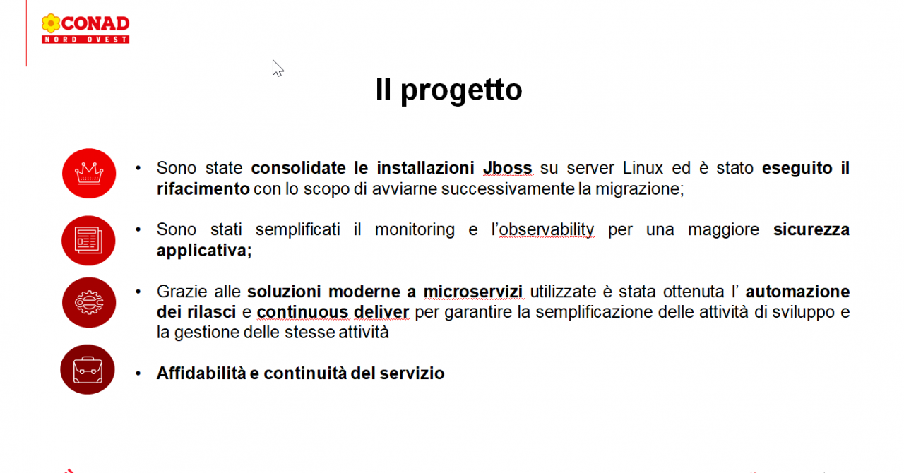 In questo disegno Conad ha cercato prodotti in grado di rispondere appieno a queste necessità, e Red Hat si è dimostrata una scelta quasi naturale sia perché già presente in Conad con competenze interne e investimenti da consolidare ma soprattutto perché "senza ombra di dubbio rappresenta il leader nella modernizzazione applicativa, soprattutto cloud-ready". Una scelta vincente così come lo è stata quella di Extra Red, un partner eccellente che da subito ha abbracciato a 360 gradi le esigenze di Conad, offrendo supporto h24, affiancamento nell’evoluzione verso applicazioni moderne e nello sviluppo di standard soprattutto in termini di sicurezza IT.