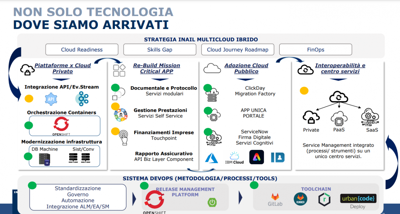 Tre anni fa l’Istituto ha definito una roadmap di adozione del paradigma cloud (con tutti i vincoli e i limiti che ha una PA che tratta data riservati, in particolare quelli medico-sanitari dei pazienti infortunati), partendo da una modello e una logica ‘cloud first’. Ha inoltre deciso di adottare il meglio esistente sul mercato, attraverso un’attenta attività di scouting al fine di creare un ecosistema integrato e al contempo diversificato in termini di tecnologie utilizzate. E, inoltre, ha scelto di adottare DevOps come nuovo modo di lavorare: una metodologia in grado di accorciare le distanze in termini di realizzazione del servizio e di semplificazione della componente gestionale.