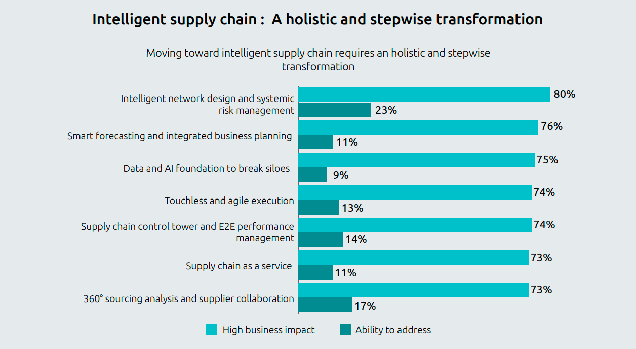 Dal momento che le organizzazioni pianificano di aumentare gli investimenti nella trasformazione della supply chain, il report suggerisce che si concentrino maggiormente sul change management e sulla formazione degli stakeholder. Sarà inoltre importante migliorare la collaborazione con gli altri attori dell'ecosistema (clienti, fornitori, partner), nonché investire in automazione e robotizzazione per migliorare l'efficienza operativa e ridistribuire le risorse (in ambiti come le interazioni con i clienti, le analisi, la pianificazione dinamica e i processi decisionali).