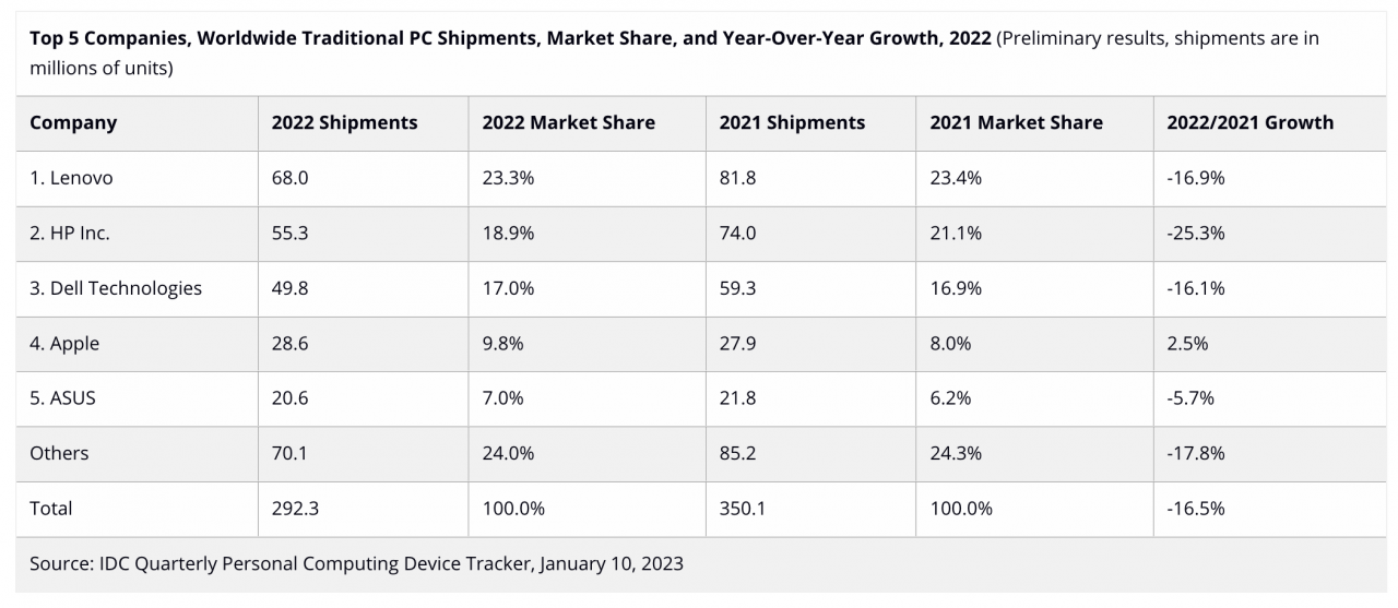 Per quanto riguarda i vendor del mercato, le dinamiche sono all'insegna della stabilità. Considerando il 2022 nel suo complesso, la Top 5 globale è la stessa dell'anno precedente. Nell'ordine: Lenovo, HP, Dell, Apple, Asus. I tassi di crescita o decrescita dei singolii brand sono ovviamente diversi, ma le posizioni sono abbastanza assestate.