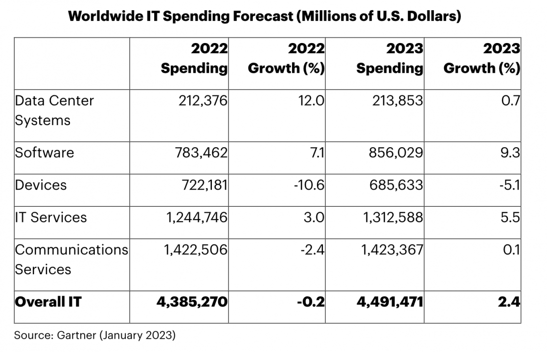 La spesa IT del 2023 dovrebbe chiudersi con un +2,4% a livello globale, per un mercato che sfiorerà i 4.500 miliardi di dollari