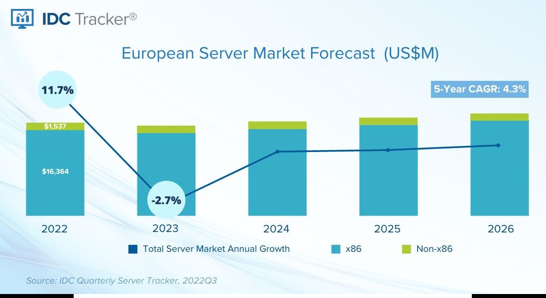 Le incertezze dei mercati globali e della geopolitica non dovrebbero, secondo gli analisti, frenare in maniera significativa il settore server nelle nazioni europee. Secondo le cifre rese note da IDC, infatti, il comparto mostra piuttosto una notevole crescita in Europa, con il terzo trimestre 2022 che ha fatto segnare una crescita in valore, anno su anno, di quasi il 28% nell'Europa Occidentale.