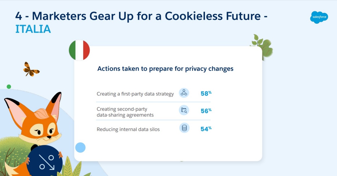 Ma, in ogni caso, tutti sappiamo di doverci preparare al cosiddetto futuro senza cookie, ovvero a dover rinunciare ai dati di terze parti. Sebbene l’81% dei marketer in Italia investa ancora in questa classe di dati, il 76% afferma di avere già una strategia completamente definita per svincolarsene. In particolare, il 58% sta lavorando alla creazione di una strategia di dati di prima parte (ovvero raccolti direttamente dai propri applicativi), il 56% sta creando accordi di condivisione per i dati di seconda parte (quelli che provengono da un'azienda partner di fiducia) e il 54% si sta adoperando per una riduzione dei silos di dati interni. Il rapporto Salesforce, inoltre, prevede il passaggio da una media di 15 data sources nel 2022 a una di 18 nel 2023.