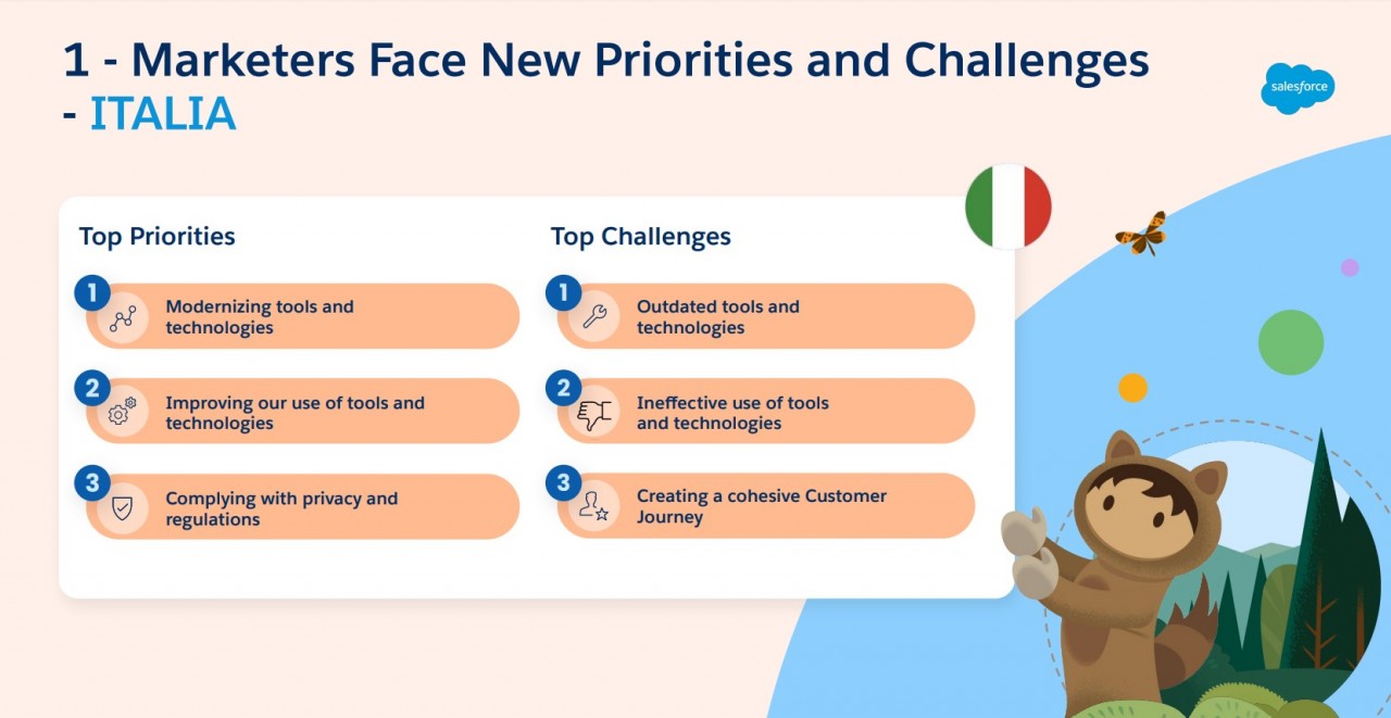 Lo State of Marketing di Salesforce è un’indagine che coinvolge più di 6mila leader del settore in 35 Paesi, tra cui l’Italia che ha contribuito con 250 manager. Il rapporto evidenzia sei temi caldi. Le nuove sfide dei marketer e il ruolo determinante della tecnologia; i nuovi canali di ingaggio dei clienti; l’attenzione alla privacy e la preparazione a un futuro cookieless; il focus sulle metriche e i KPI che servono veramente e la condivisione dei valori aziendali.