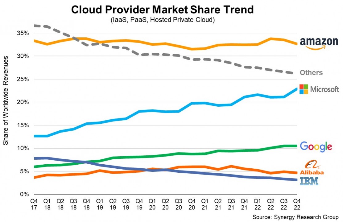 Si conferma anche a fine 2022 una constatazione fatta ripetutamente negli scorsi trimestri: il cloud resta un gioco per pochi. Essenzialmente per chi ha sia tecnologie e capacità di investimento, sia la possibilità di sfruttare economie di scala. Insieme, i tre cloud provider principali (AWS, Microsoft, Google) fanno il 63% del mercato del cloud infrastrutturale. Se consideriamo solo i servizi IaaS/PaaS del cloud pubblico - che sono la componente principale del mercato - questa percentuale sale al 73%.
